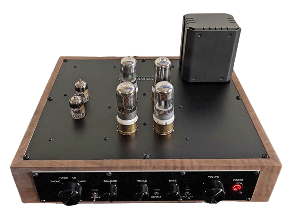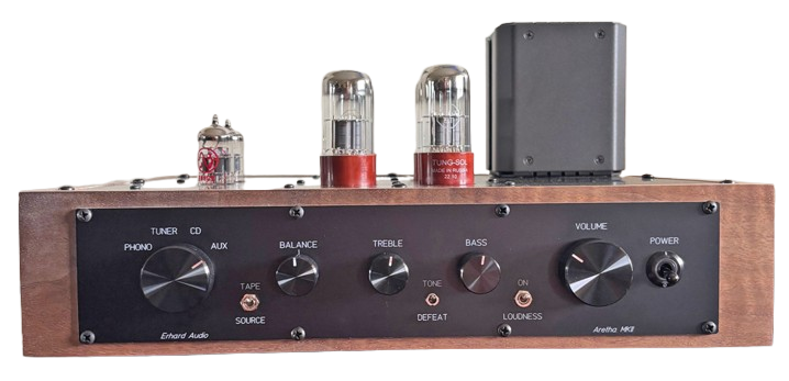 Designed with the audio enthusiast in mind, Aretha LT is a single ended 6SL7 based preamplifier. The circuit is a cathode follower with Baxandall tone controls, all housed in a custom wood chassis.
