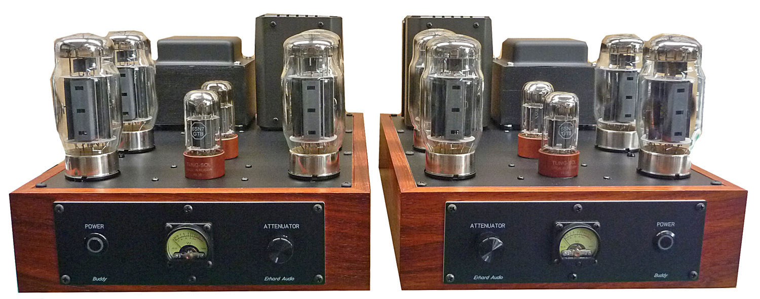 Buddy is built around a quad set of KT120's beam tetrodes in a parallel push-pull configuration with a preamp/driver section consisting of two Tung Sol 6SN7's.