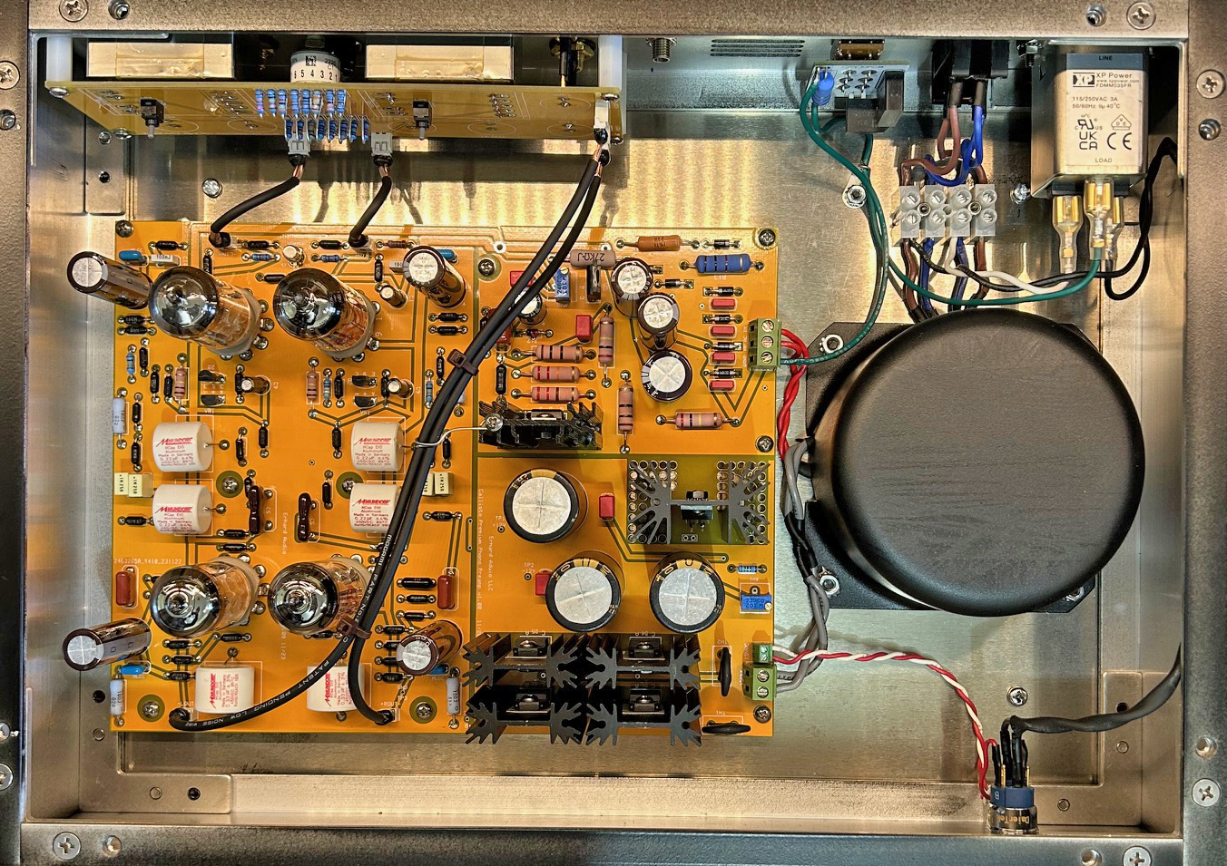 Coupling capacitors are Mundorf MCap EVO's, signal path resistors are Vishay and TE Connectivity high precision film types.