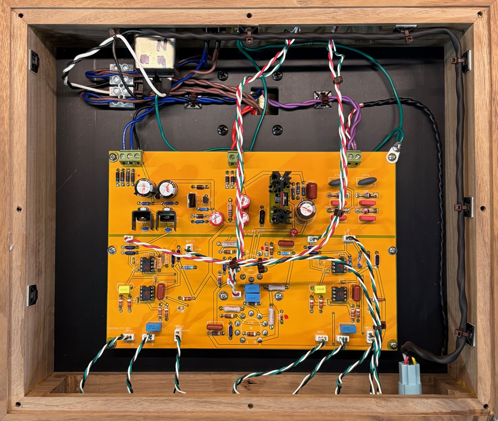 Cantare uses a hybrid circuit, the tone controls use the OPA2134 ultra low noise Op-Amp. The bass and mid tone controls are a gyrator circuit to simulate an inductor, treble uses a capacitor and resistor for frequency shaping, followed by 6922/E88CC Aikido cathode follower output buffers.
